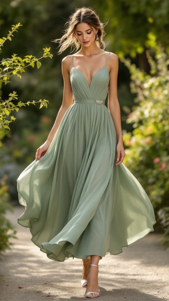 Daytime weddings call for something light, graceful, and easy to wear. Softer shades of green paired with flowy fabrics feel romantic without stealing the spotlight. These styles work beautifully for garden venues, outdoor ceremonies, and warm-weather celebrations.