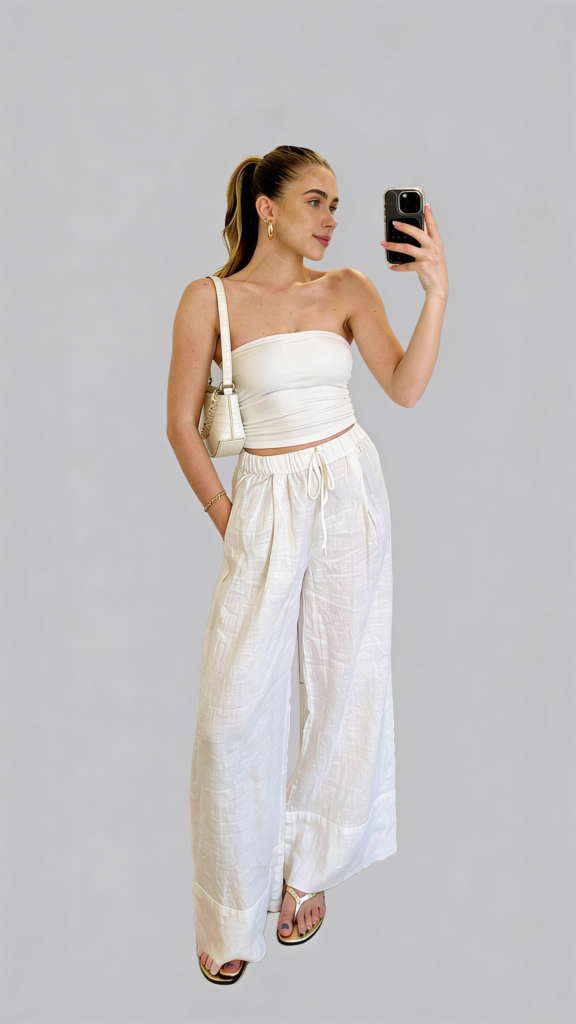 That moment usually comes down to structure. Linen flows naturally, so you need at least one element in your outfit that adds shape. Think a slightly fitted tank, a tucked tee, or a structured button-down. When you define your waist even a little, the whole look shifts from relaxed to intentional.
