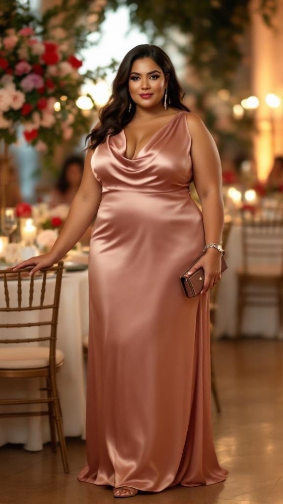 Satin dresses instantly elevate your look while still feeling smooth and wearable. Cowl necklines and wrap hems create gentle movement that flatters curves without clinging. These styles feel especially right for evening or semi-formal spring weddings.