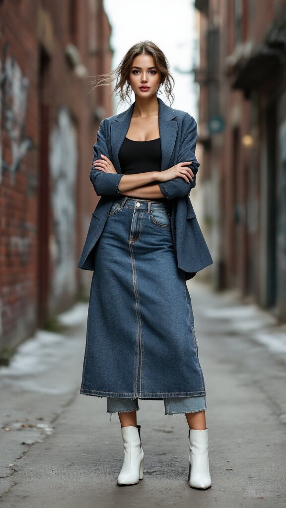 Choose different washes to create separation. A darker denim skirt over light-wash jeans keeps the layers distinct. Add a structured blazer or fitted top to anchor the outfit.