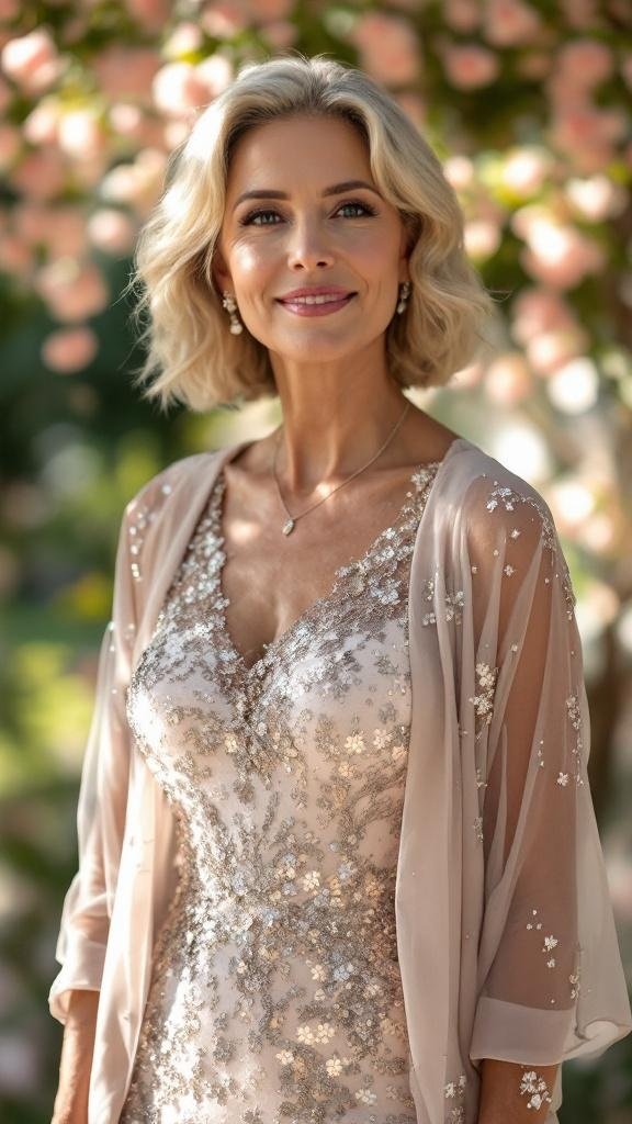 This two-piece sequin dress delivers just the right amount of sparkle for spring celebrations without feeling overdone. The matching jacket adds coverage and flexibility, so you stay comfortable from ceremony to dance floor. You’ll love the **subtle shimmer, forgiving fit, and polished layers.